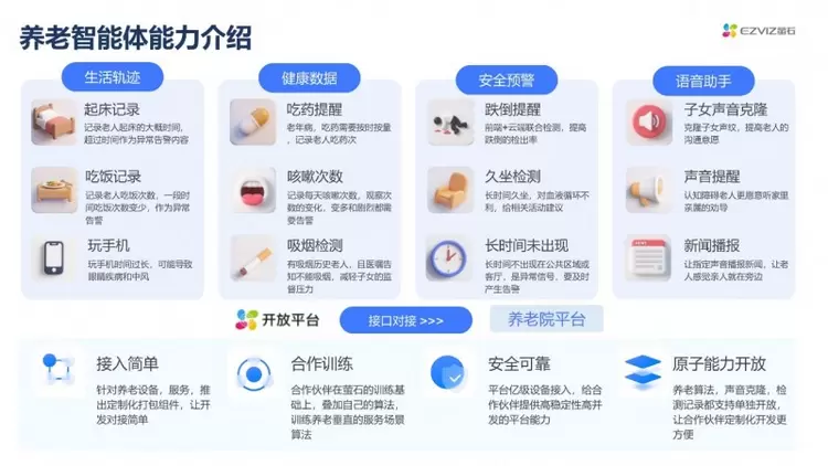 为进一步推动智慧养老场景的多元化落地,萤石依托自研的萤石蓝海大模型,创新性推出养老智能体,通过开放生活轨迹功能、健康数据模块、安全预警功能、语音助手技术四大能力,为养老机构及家庭提供更高效、更灵活的智慧养老解决方案。