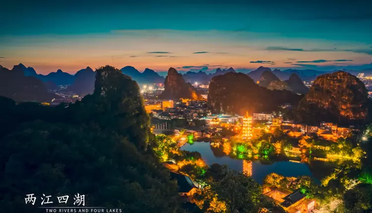 夜游两江四湖,华灯初上,日月双塔交相辉映,桂林城在璀璨灯火中展现出与白天截然不同的魅力。