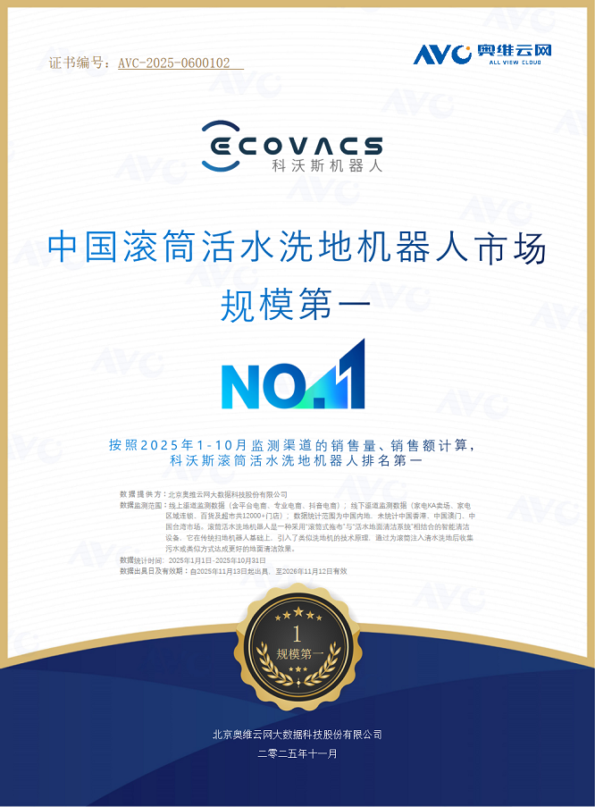 近日,权威市场研究机构奥维云网(AVC)发布认证,科沃斯机器人斩获中国滚筒活水洗地机器人市场规模第一。这份认证不仅肯定了科沃斯滚筒洗地机器人开拓者、领导者的地位,更标志着科沃斯率先开创的滚筒活水技术路径,已从行业创新方向升级为主流消费选择。