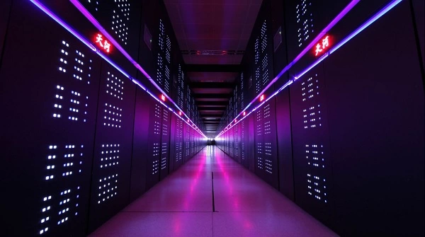 绿岛风总经理李清泉(右)参观国家超算中心主机房