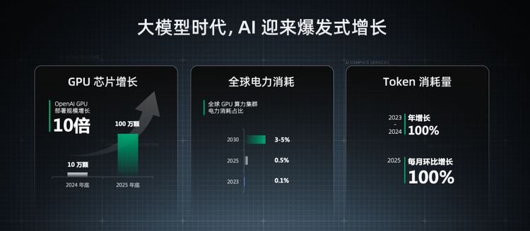 在大模型时代,AI 迎来了爆发式增长,变成了一个非常确定性的事情,我们可以从几个维度的数据看到这样的变化:第一就是 GPU 芯片的增长,OpenAI 在 2024 年底只有 10 万颗 GPU,到今年年底预计增长 10 倍,到 100 万颗 GPU;第二个维度是电力的消耗,全球 GPU 的电力消耗占全球电力消耗的比重,2023 年只有 0.1%,今年达到了 0.5%,预计到 2030 年将会达到 3%-5%,这是一个巨大的增长和变化;第三个维度是 Token 消耗量,与 2023 年相比,2024 年 Token 消耗量增长了 100%,进入 2025 年之后,Token 消耗量急速上升,今年上半年每月的环比增长就超过了 100%。