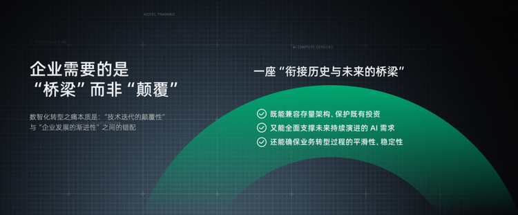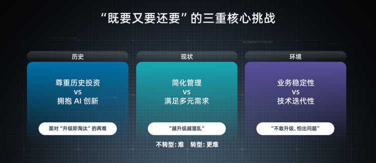第一,既要尊重历史投资,又要拥抱 AI 创新,就是新老不兼容、“升级即淘汰”的核心挑战。