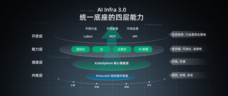 最底层的能力是内核层。青云推出了 PrimusOS 信创操作系统,这会成为我们所有平台功能的核心 Kernel 和底座,以确保信创适配,包括与不同芯片的适配,确保合规和安全,也确保了极致的性能调用。
