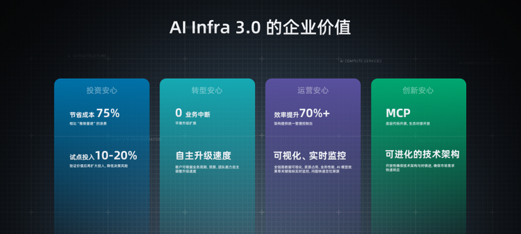 因此,青云 AI Infra 3.0 给企业客户带来的四点价值,也回应刚才企业在数智化转型中面临的困难和挑战:投资安心、转型安心、运营安心、创新安心。