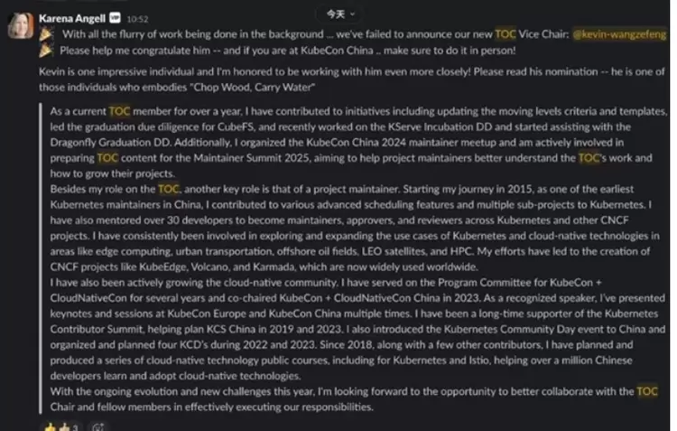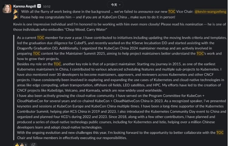 ▲ 2025年5月王泽锋当选 CNCF TOC 副主席,TOC 主席 Karena Angell 致贺