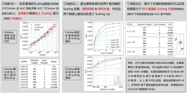 另外,“Climber”还同时从“架构设计-加速技术-资源分配”三个层面协同优化,让推荐模型既能“变大”(捕捉更多信息),又能“跑快”(控制资源消耗)。而此前,行业内的解决方案存在明显短板,没有形成“效果-效率”双优的闭环,无法满足工业级推荐“大”和“快”兼备的需求。
