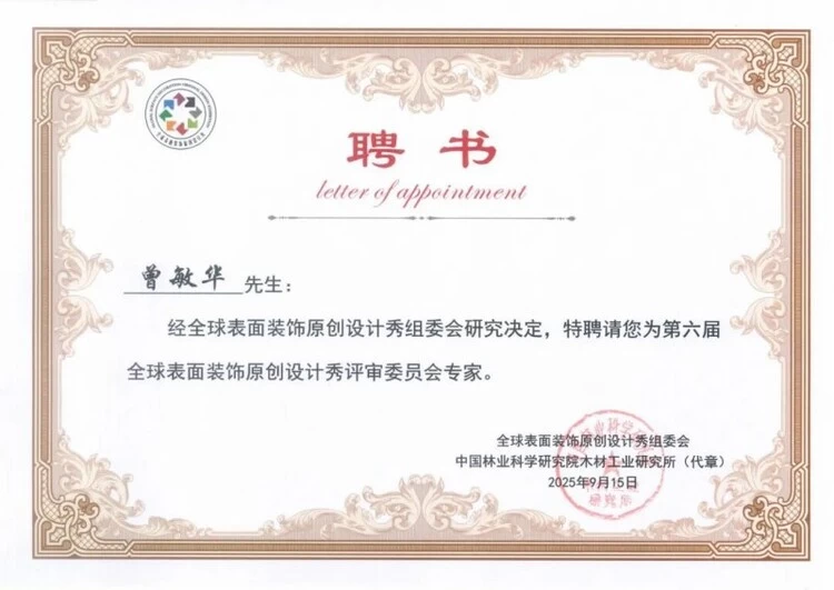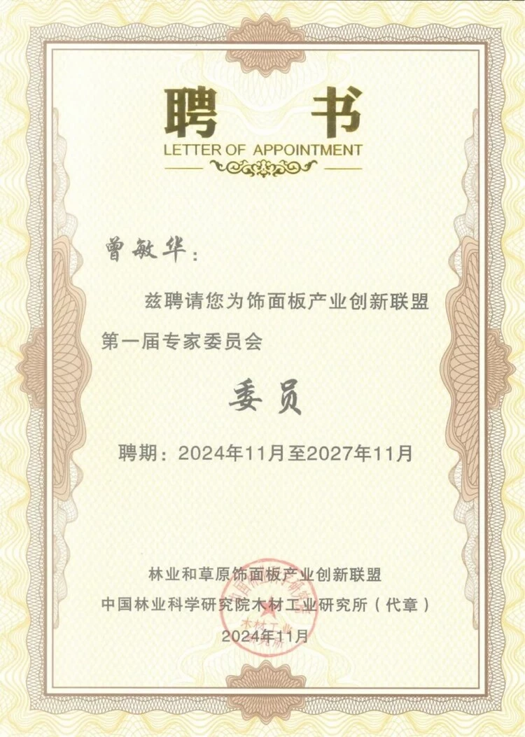 ▲耀东华集团董事长曾敏华先生被聘为饰面板产业创新联盟第一届专家委员会委员