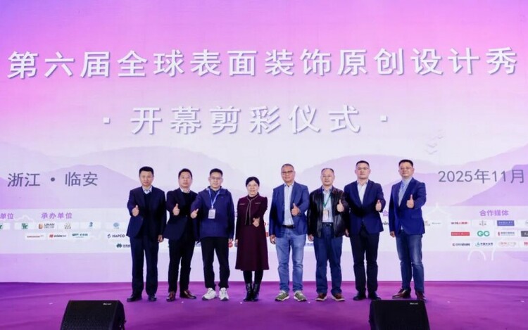 随后,耀东华集团董事长曾敏华先生(左四)携手中国林产工业协会执行秘书长唐召群(左三)、中国林业科学研究院木材工业研究所副所长、研究员郭文静女士(中)等一众行业代表,共同为第六届全球表面装饰原创设计秀盛大开幕剪彩。此次设计秀宛如一个创意磁场,汇聚了全球各地的优秀创意与前沿理念,势必将为行业带来全新的视野与深刻的启发。