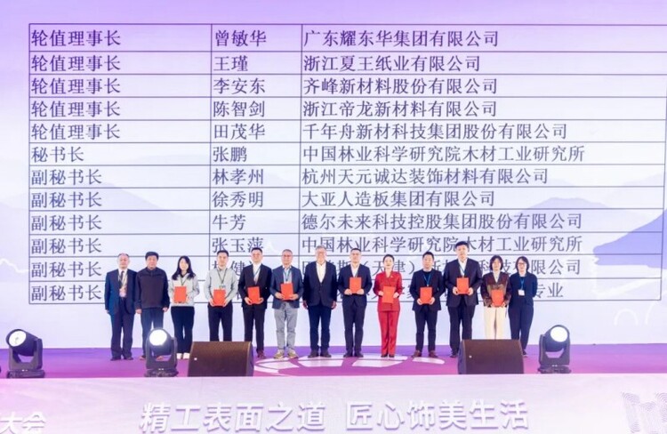 ▲耀东华集团董事长曾敏华先生(左六)荣获中国林产工业协会装饰纸与饰面板专委会第四届理事会轮值理事长