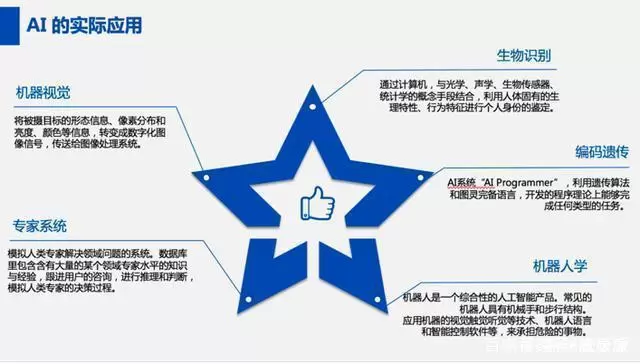 AI主要应用在机器视觉、生物识别、编码遗传、专家系统、机器人学上。有了AI的深度学习,云计算便可以对大数据的精准分析,伴随着新科技时代的到来,这三者的巧妙融合会是我们科技时代中的新的里程碑。
