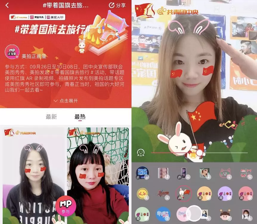 为迎接祖国69岁生日,9月26日,共青团中央宣传部联合美图秀秀、美拍发起了#带着国旗去旅行#话题活动。美拍为活动定制了红旗AR特效,鼓励用户参与活动,用短视频记录分享国庆出游美好时光,展现祖国喜人的新面貌,为祖国母亲献礼。