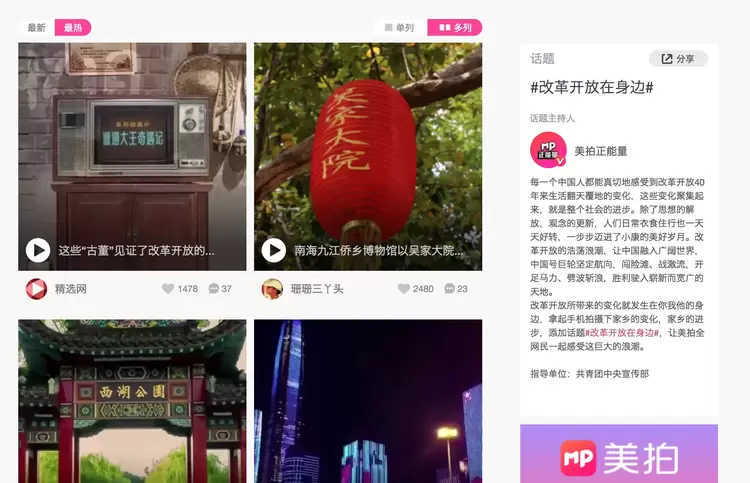 今年7月,在中央网信办的指导下,美拍发起了#遇见最美劳动者#视频征集活动,呼吁大众用短视频记录生活中所遇见的尽职尽责、品质美好的劳动者,用积极正面的内容发掘普通劳动者身上最美的一面。此前,美拍还与中国新闻社发起了#改革开放在身边#主题活动,鼓励美拍用户以创意短视频记录改革开放为生活带来的变化。这些活动都获得了用户的踊跃参与,优质短视频内容的社会影响力也在潜移默化中不断提升。