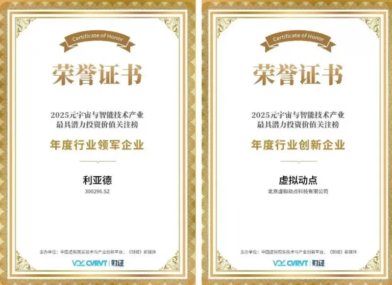 近日,由中国虚拟现实技术与创新平台(CVRVT)和《财经》新媒体共同发起的“2025元宇宙与智能技术产业最具潜力投资价值关注榜”评选结果揭晓。利亚德及旗下虚拟动点双双上榜,分别荣获“年度行业领军企业”称号及“年度行业创新企业”称号。