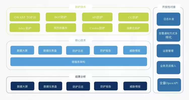 作为采用云原生架构的WAF产品,平台基于容器和微服务技术开发,实现转发、检测、日志、分析、管理节点的解耦和开放。这种架构设计显著降低了企业的系统集成和运维成本。