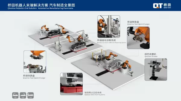据了解,桥田智能的核心产品机器人末端快换装置自2020年起已陆续进入主流主机厂供应链,并通过TÜV、VDA6.4、CE、ISO等多项行业权威认证,奠定了其技术合规性与市场认可度。目前公司已形成三大核心产品线:白车身装配和焊接机器人末端解决方案、高频快速换模与工业连接器、三电领域精密装配系统,具体涵盖快换盘、抓取系统、修磨机、磁力换模系统等关键设备,全面覆盖智能制造末端执行场景。