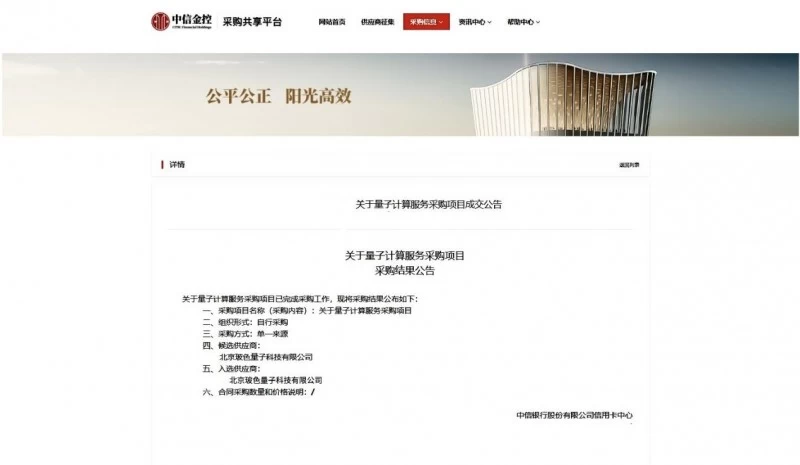 中信金控丨电子招采系统官网发布关于量子计算服务采购项目成交通知书。成交通知书显示:北京玻色量子科技有限公司成功中标关于量子计算服务采购项目。