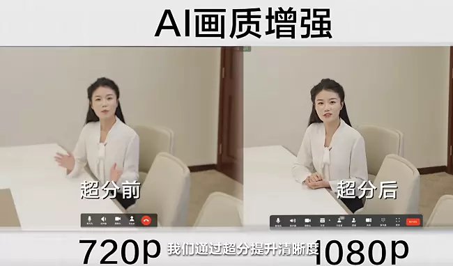 在“看得清”层面,华为 IdeaHub 系列产品并未满足于通用的 4K 标准,而是采用了专业级的1800 线 4K 摄像机。而针对一些云会议,视频清晰度一般在 360P 到 720P 这个区间。为了让大家在有限条件下获得更清晰的视频体验,华为推出了 AI 画质增强功能,其中的视频超分能力可以自动提升清晰度,从 360P 到 720P,甚至到1080P。