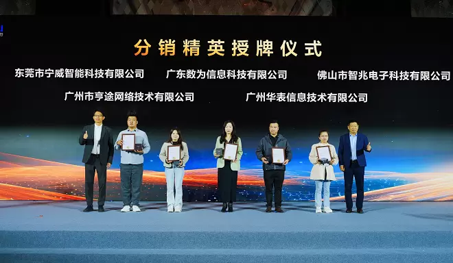 活动设置多项重磅环节,分销精英授牌仪式和先锋工程商颁奖仪式隆重举行,分别有5家分销精英和5家先锋工程商上台领奖,这正是“百&万计划”伙伴体系建设的关键落地举措,承载着推动合作伙伴向多产业精英升级、共拓中小企业智能化市场的战略愿景。