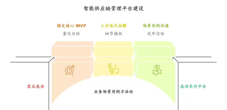 以场景用例为核心沟通工具:一方面定期交付可运行MVP,让R公司业务人员实时掌控进度、可视化成果,提升客户掌控感;另一方面将已验收用例包装为可量化阶段性成果,辅助客户向高层汇报,锁定管理层持续支持,规避项目后期验收风险,筑牢双方信任根基。