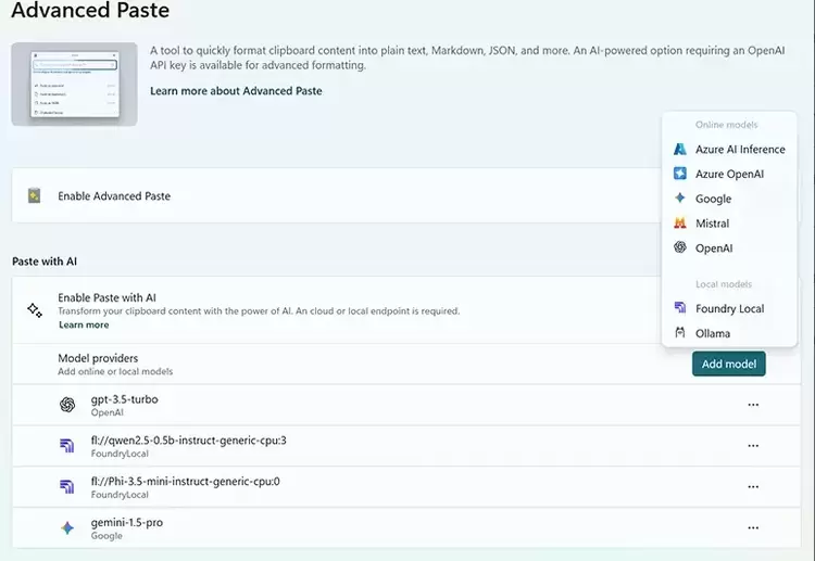 除了支持设备端AI,高级粘贴功能现在还支持配置多种在线模型,包括Azure OpenAI、Gemini和Mistral。而此前该工具仅兼容OpenAI。