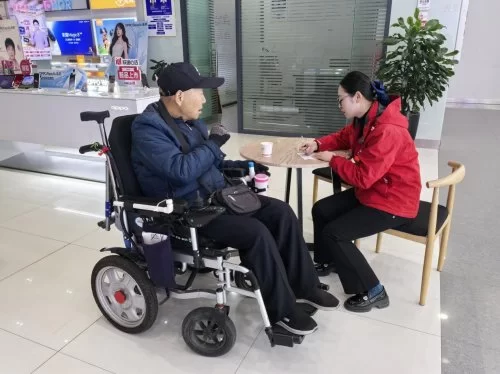 当天,泉口营业厅内前来办理业务的用户络绎不绝,等候区座无虚席。一位残疾客户进来后,正在忙碌的营业员第一时间注意到他的情况。考虑到客户行动不便,且现场等候人员较多,营业员立即主动上前,轻声询问客户需求,并热情邀请他前往休息区就座。