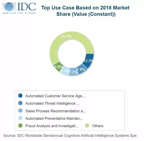 在2018年,全球认知和人工智能领域最大总支出的用例包括:自动化客户服务代理、自动化威胁情报和预防系统、销售流程推荐和自动化以及自动化预防性维护,支出分别为29亿美元、19亿美元、17亿美元以及17亿美元。在预测期内,投资增长速率最快的领域为药物研究和发现、专家购物顾问和产品推荐、企业知识工作者的数字助理以及智能处理自动化,年复合增长率分别为46.8%、46.5%、45.1%和45.1%。