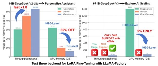 在性能对比测试中,KTransformers微调方案优势显著。在较小规模的MoE模型(DeepSeek-14B)测试中,其吞吐速度超过传统方案1.8倍,显存占用较传统方案降低 82%。传统方案多依赖H100等高端 GPU,而KTransformers可支持4090级消费级显卡,大幅降低了硬件门槛。这一方案让创新门槛显著降低,学术研发领域能尝试更多样化的想法,企业应用层面可针对自身需求快速微调出定制化模型,且成本和周期大幅缩减,产品迭代更灵活高效。