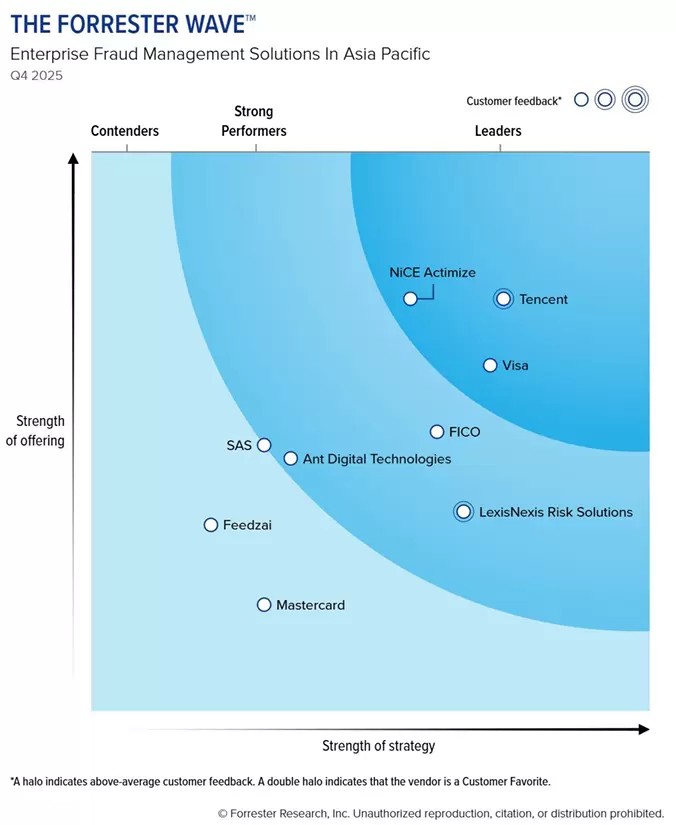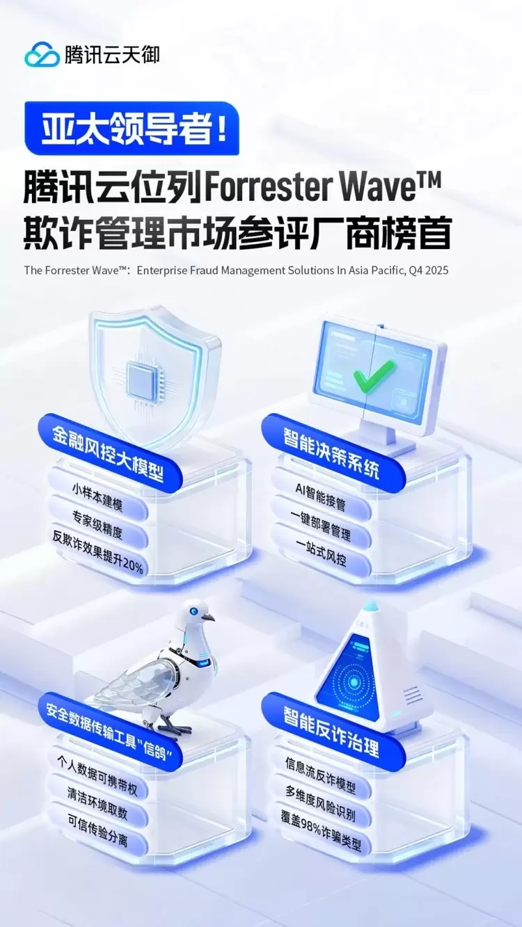 近日,国际权威研究机构Forrester发布《The Forrester Wave™: Enterprise Fraud Management Solutions In Asia Pacific, Q4 2025》报告(以下简称“报告”),腾讯云在评选中位列亚太地区企业欺诈管理市场“领导者”象限,并在服务能力、战略维度位居参评厂商榜首。值得注意的是,今年的报告新增了客户反馈评级,腾讯云在此项中获得“Above Average(高于平均水平)”的评价。