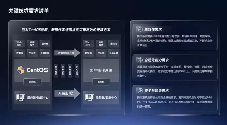 在信托行业,科技从业人员数量远远低于银行的体量,在操作系统国产化替代过程中要求尽可能选择能够提升整体迁移效率以及辅助迁移的方案或服务,对自动化迁移的能力、备份、回滚、全流程自动化、降低迁移成本等方面有着极高的要求。对于后期的安全与运维需求,同样要兼容现有公司内部安全运维基线,能够满足信息安全需求,实现运维系统、监控系统的统一管理,技术选型关键技术清单要求如下:
