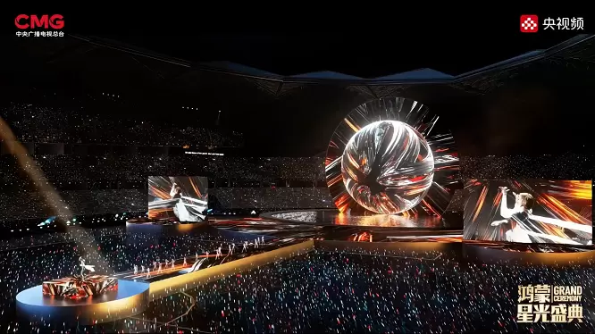 盛典的形式创新,也同样呼应了科技传播需要文化赋能的趋势。在科技叙事容易陷入技术参数堆砌的当下,盛典以“天圆地方、水火交融、万物互联、天地共生”为核心理念设计舞台,将东方哲学与未来科技美学结合,降低了公众对硬核科技的理解门槛;而“混沌初开万象新”等四大诗词主题篇章,则以文化脉络串联技术发展历程,让鸿蒙从无到有的成长轨迹更具故事感。