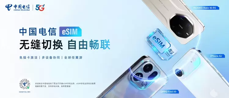 近日,中国电信eSIM手机业务再添新助力——继iPhone Air之后,近期OPPO Find X9 Pro eSIM卫星通信版和华为Mate 80系列eSIM手机相继上市销售。这是中国电信eSIM服务正式获得工信部商用试验批复、在全国31个省、自治区、直辖市同步上市后的又一实质性进展,标志着中国电信eSIM服务实现从智能手表、车载设备到智能手机的全场景覆盖,加速迈向“无卡化”数字通信新时代。
