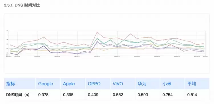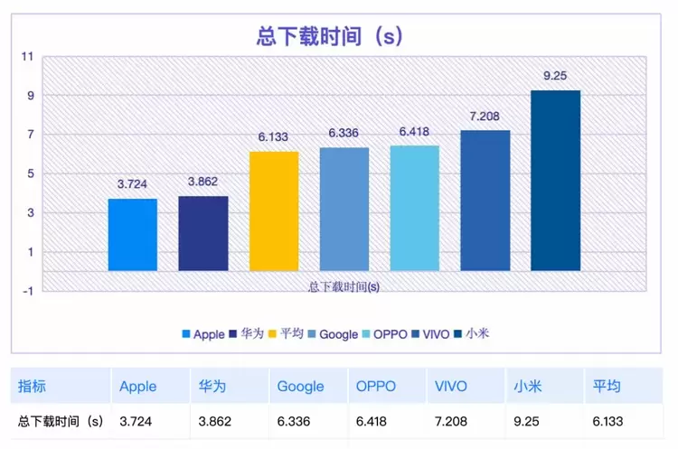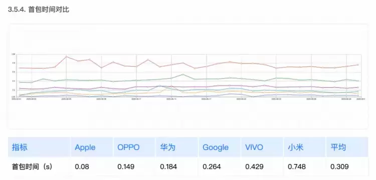 Apple 在首包响应时间上表现最为亮眼,仅需0.08秒即完成初次响应,OPPO 与华为紧随其后。