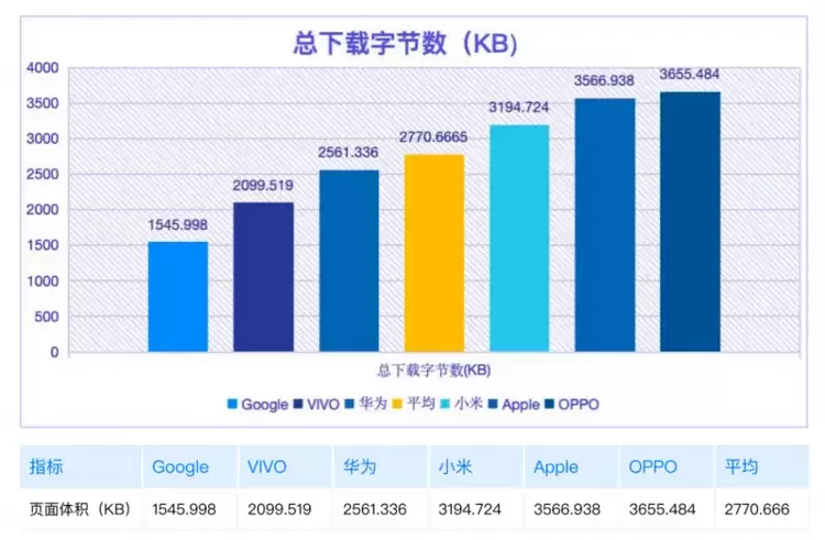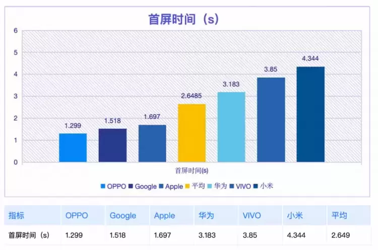 首屏加载作为衡量用户“第一眼体验”的关键指标,在本次测评中差距同样显著。OPPO 以1.299秒的成绩位列第一,Google(1.518秒)与Apple(1.697秒)紧随其后,均控制在“理想区间”2秒以内。而小米的首屏时间则达到4.344秒,已显著高于平均值,用户等待成本显著增高。