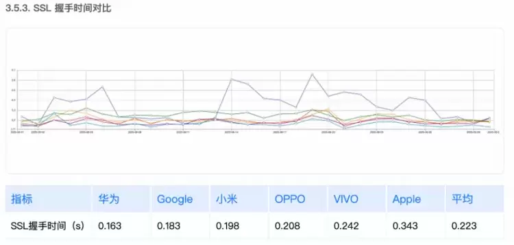 SSL 握手时间中,华为以0.163秒成为最快品牌,体现出其在安全传输效率上的优势。