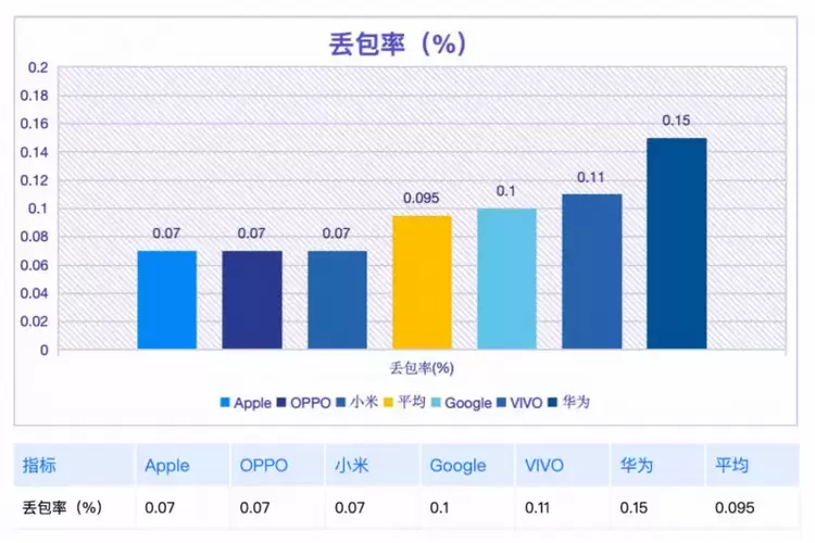 Apple、OPPO、小米的丢包率同为0.07%,远低于1%的风险阈值,说明多数品牌在基础网络层已建立起较为稳固的抗干扰机制。