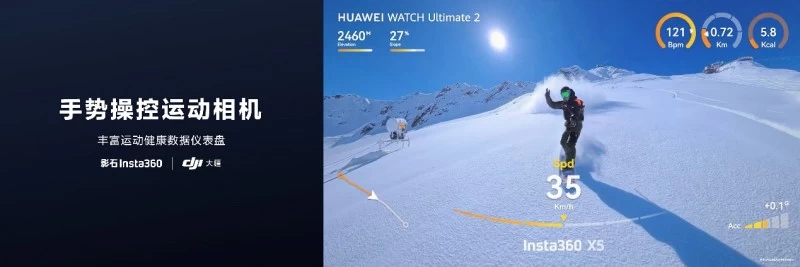 HUAWEI WATCH Ultimate 2 非凡探索还能与三方相机(影石Insta360、大疆DJI)实现互联,让户外运动更便捷有趣。已支持多款全景相机、拇指相机、运动相机通过手表app进行互联,并通过手表手势操控轻松控制拍摄。其中,影石Insta360为华为穿戴用户打造了首款定制仪表盘,心率、速度、位置等数据可嵌入视频画面,让运动体验记录更丰富。