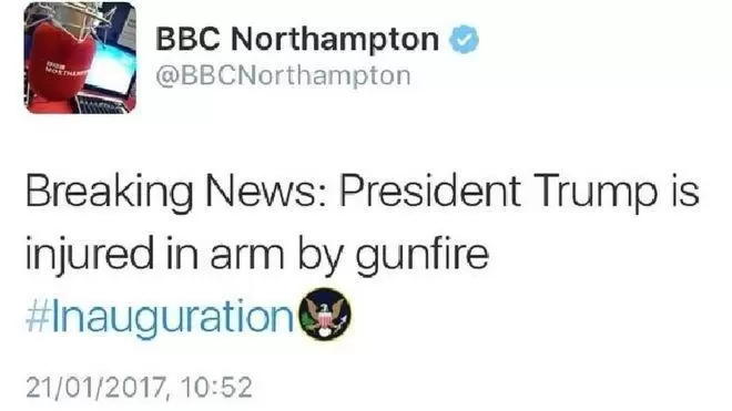 甚至连以公信力著称的BBC也难以幸免,比如BBC北安普顿分站的推特账号就曾发过这样一条消息:Breaking News: President Trump is injured in arm by gunfire #Inauguration.(劲爆消息:特朗普总统在就职典礼后遭遇枪击,手臂受伤。)