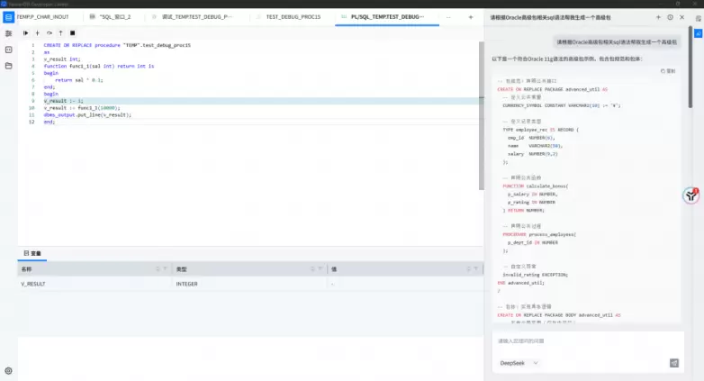 崖山开发者工具(YDC):V23.5推出 AI助手,支持配置 DeepSeek、混元、通义千问等主流大模型引擎,实现自然语言与SQL的双向转换、智能建表及测试数据生成,显著降低 SQL 开发门槛;同时,PL/SQL调试能力全面增强,优化了变量与断点管理,并支持调试状态持久化。在可视化管理功能方面,新增调度器、物化视图、类型、DBLINK、回收站等对象,为高效开发提供强大支持。