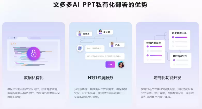 无论企业技术基础如何,文多多都能为您提供最适合的AIPPT私有化部署方案,轻松完成部署,开启安全、高效的AIPPT办公新体验。