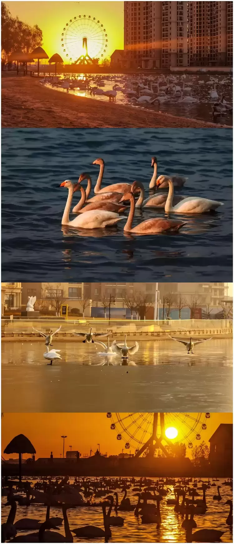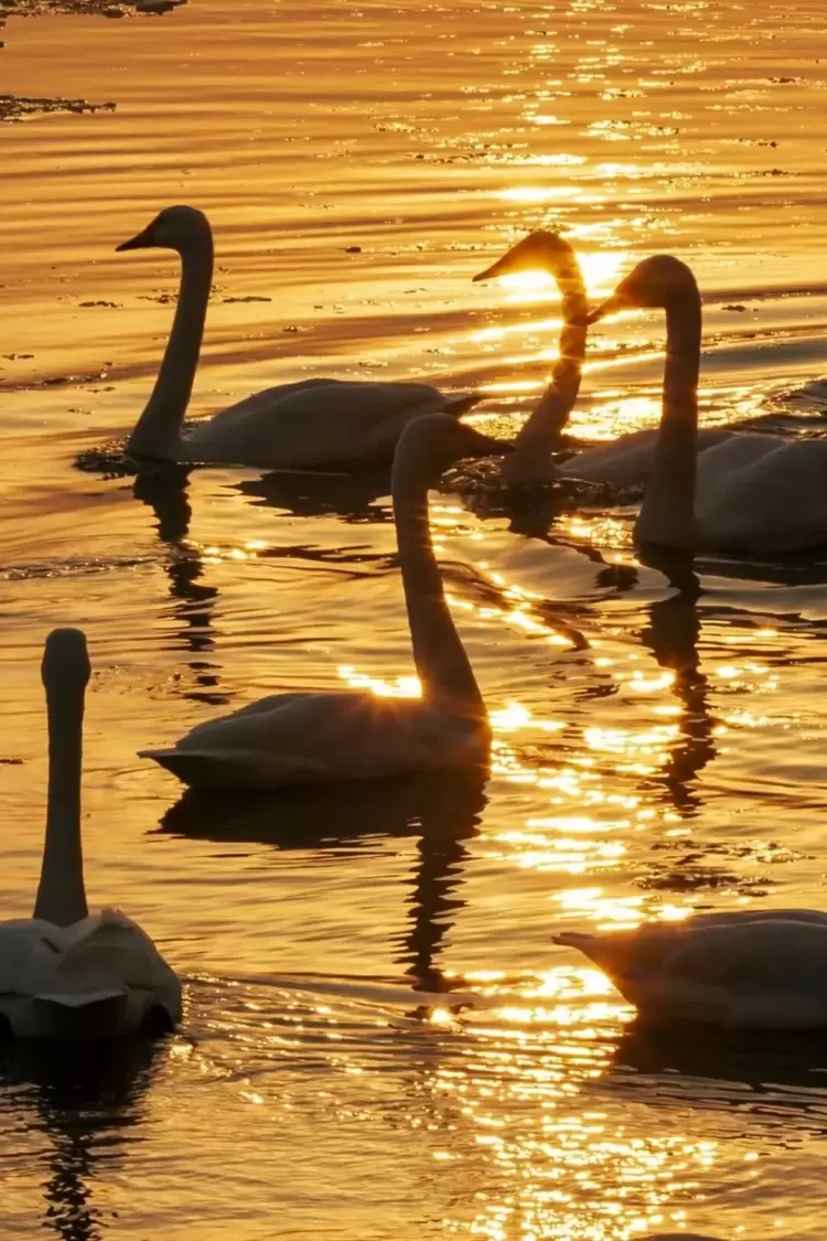 绝美的创意构图:以远处的群山、森林或那香海小镇建筑为背景,将天鹅作为画面的灵动主角。尤其在日出日落时分,金色的光线为白色的天鹅群披上霞光,成就一幅无可复制的自然画卷。