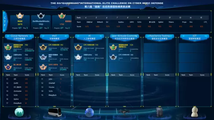 首先,在CTF赛道,W&M战队表现强势,以2875分的总成绩暂居榜首,并且是目前唯一一支进度达到3/7(获取3个Flag)的战队,紧随其后的是Zer0RocketWrecks和极速逃生的战地群星巴士战队,竞争胶着。
