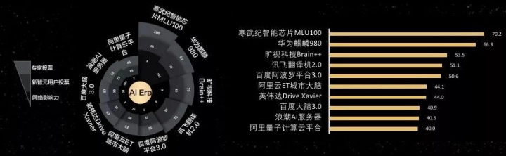 AI产品影响力TOP10:寒武纪智能芯片MLU100、华为麒麟980、旷视Brain++、讯飞翻译机2.0、百度Apollo3.0、阿里云ET城市大脑、英伟达Drive Xavier、百度大脑3.0、浪潮AI服务器、阿里量子计算云平台