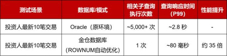 在交易明细查询方面,用户经常需要实时获取最新交易记录,而Oracle数据库在处理此类请求时存在明显的效率瓶颈。例如,在查询“最近10笔交易”时,系统不仅会重复执行账户状态检查操作,还采用“全排序后筛选”的低效逻辑,导致响应缓慢。金仓数据库通过智能查询优化机制,将重复查询操作提前合并执行、优先利用索引定位数据,并尽早应用结果条数限制,实现了查询路径的整体优化。实际测试表明,查询响应时间从2.8秒降至80毫秒,提升约35倍,且无需业务系统改造即可生效。