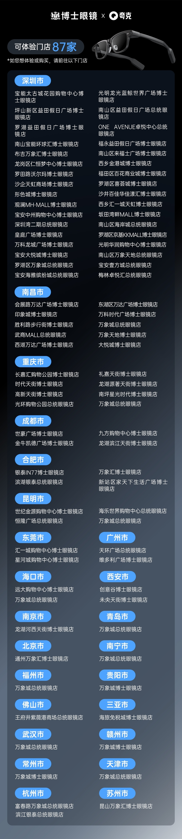 服务落地:多家门店同步开启体验和验配服务即日起,前往以下博士眼镜门店(详见下图)即可体验和购买夸克AI眼镜S1,并且在门店购买夸克AI眼镜S1的用户可享受专业的验光与配镜服务。博士眼镜将依托其严谨的验配流程与服务经验,确保每一位用户都能获得清晰、舒适且与智能眼镜形态完美契合视觉解决方案。