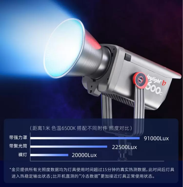 在美妆 / 服饰直播以及影视外景拍摄等场景中,对于高亮大功率补光灯的需求非常迫切。金贝 JL-600C 补光灯拥有630W的输入功率,能够提供专业级高亮度表现。裸灯下可以实现20000Lux的照度(色温6500K,距离1米),搭配强力罩可达到91000Lux。即使服装直播等大场景布光中也能提供充足光线,轻松满足“长时间、高频次” 布光需求。