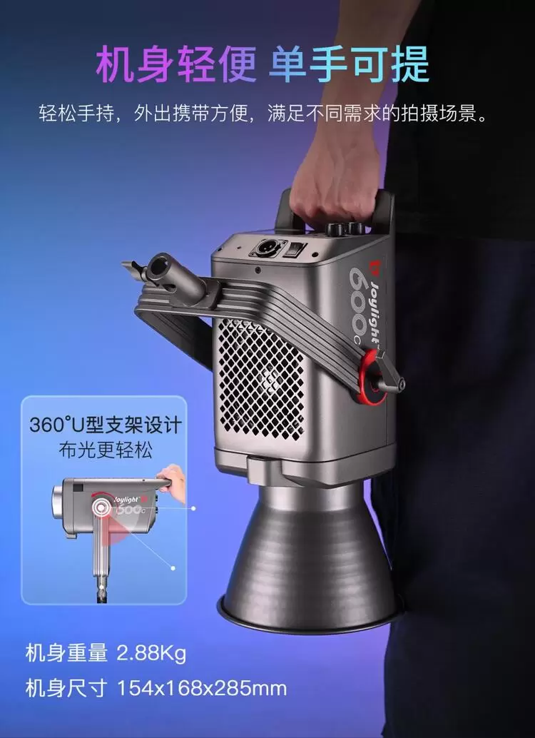 JL-600C 灯体仅重 2.88Kg(含把手不含 U 型支架),单手就能拎得动,外出携带也不会太重,在布光时更能得心应手。同时还有 360°U 型的支架设计,自由调整布光角度,无论是俯拍补光、侧光填充还是逆光勾勒,都能快速调整到位,提升布光灵活性。