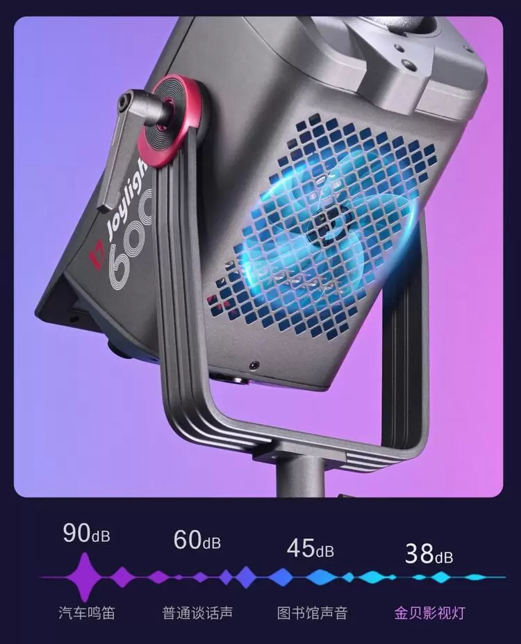 长时间拍摄,灯具的散热也是影响光质的因素,JL-600C补光灯搭载了强劲热导流宽域散热系统,能够智能温控精准调节,工作时噪音比在图书馆还要低,避免影响剧情片同期收音拍摄,访谈类直播等场景的现场收音。