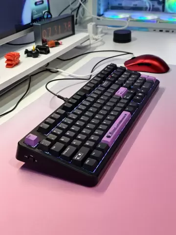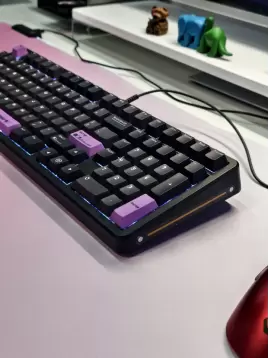质感与光效:我手上的黑紫款配备了五面热升华键帽,耐磨且图案精致。配合新一代ARGB灯效系统,亮度高且均匀,电竞氛围瞬间拉满。