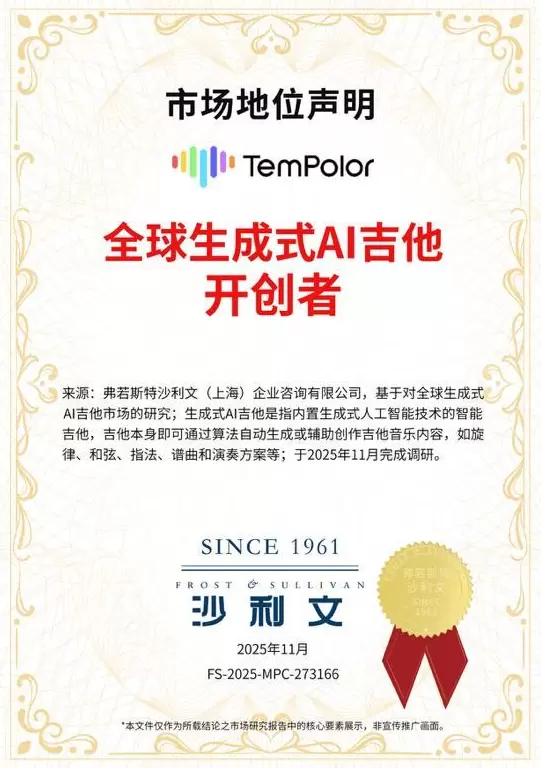 11月26日,全球权威研究机构弗若斯特沙利文正式向趣丸科技旗下品牌TemPolor授予“全球生成式AI吉他开创者”行业地位声明书,认定TemPolor在生成式AI吉他领域具备开创者地位。这意味着TemPolor智能吉他的创新性和领先性,获得国际第三方权威机构的高度认可。