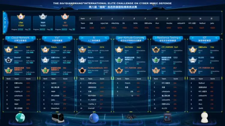 ·CTF赛道:共设置22道赛题,来自哈尔滨工业大学的Lilac战队解出21道,唯一未被攻破的是由紫金山实验室内生安全团队提供的拟态sql注入题;